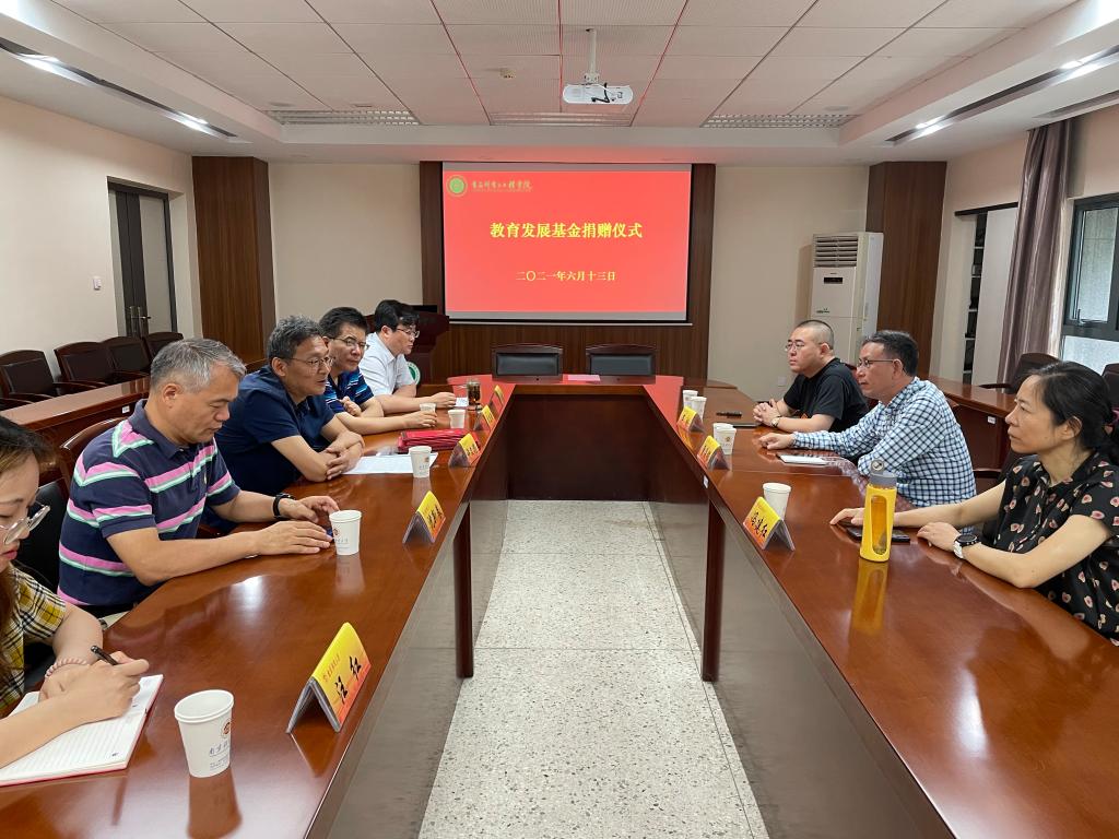教育发展基金捐赠仪式在工科楼211会议室举行,粮油储藏8304班校友、侨基集团董事长曹昌银先生及夫人冯建红女士,应用化学0941班校友、中青产经资本有限公司董事长芦刚,黄色导航