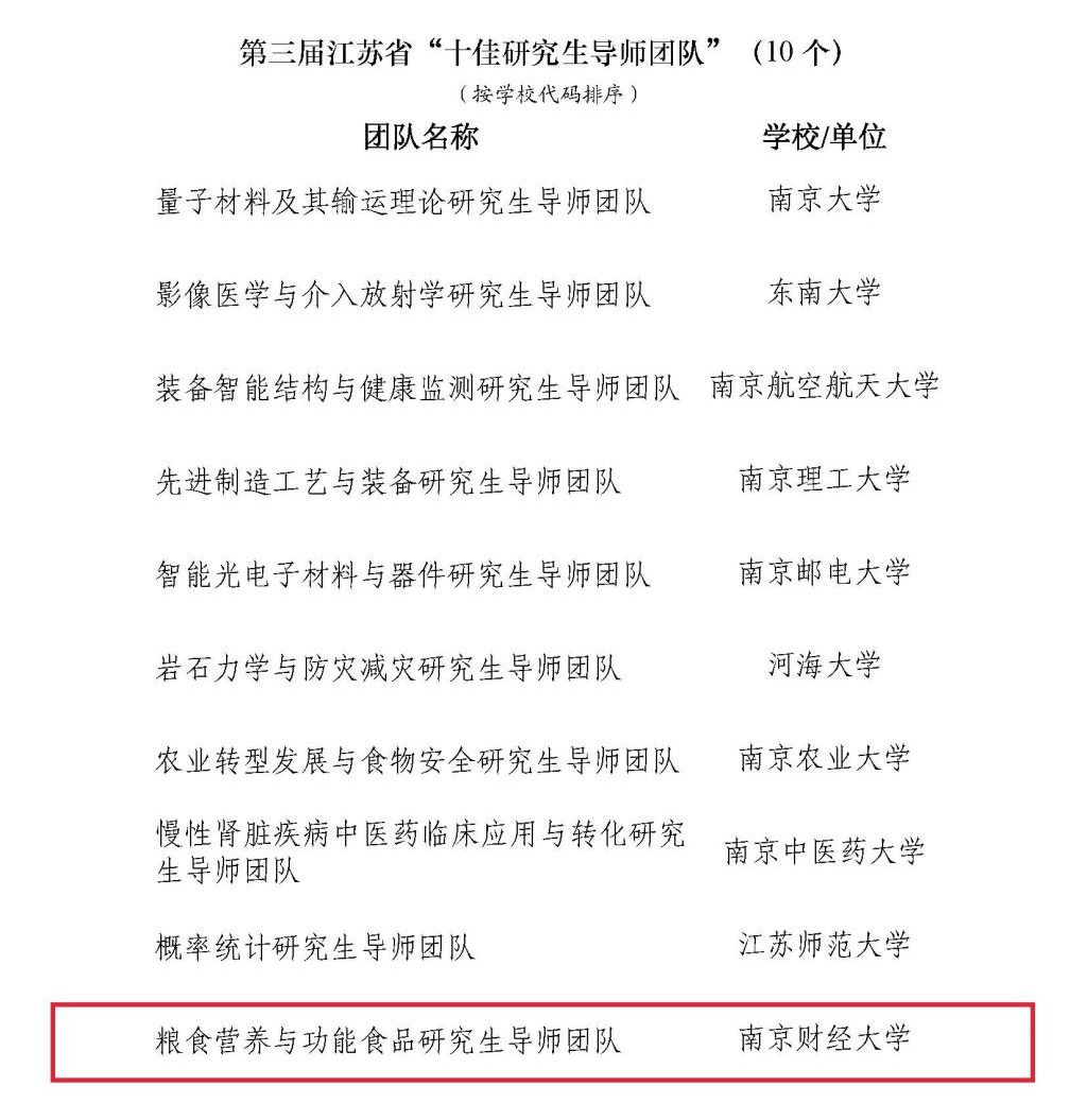 粮食营养与功能食品研究生导师团队获江苏省“十佳研究生导师团队”称号。