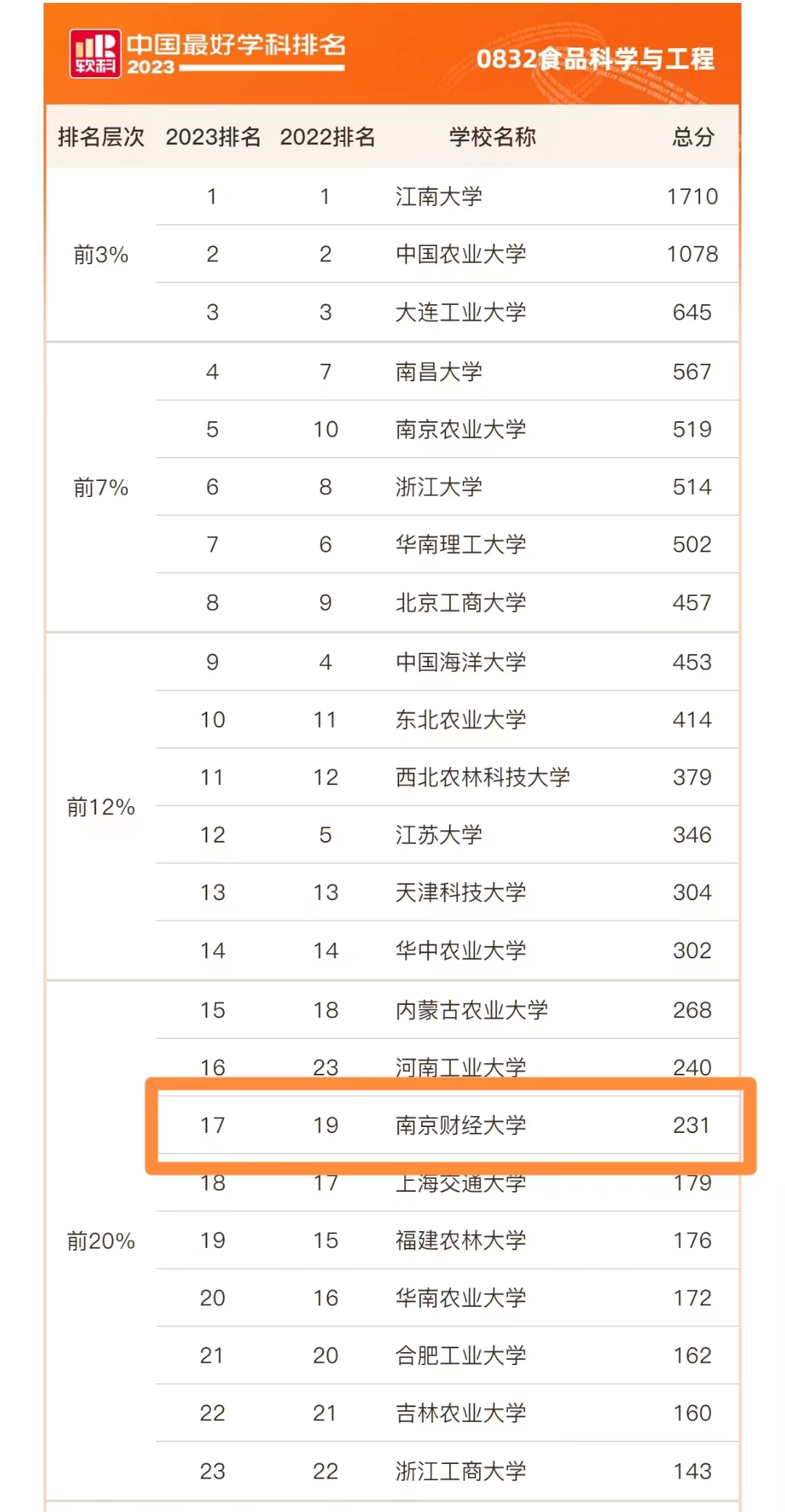 食品科学与工程学科上榜。排名全国前20%,位居全国第17位,相较去年排名前进2位。