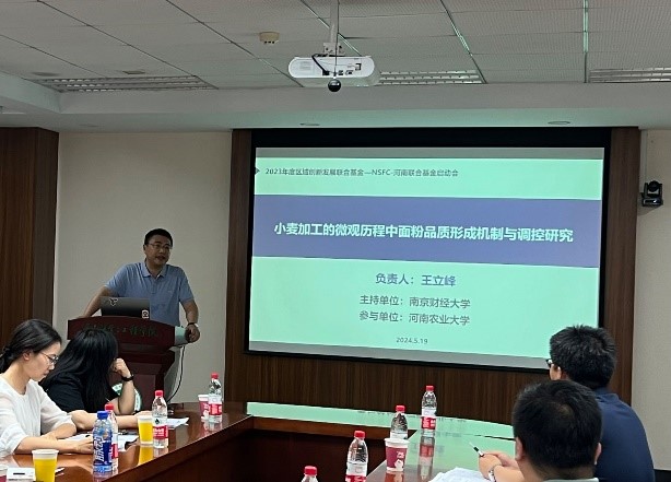 会议由项目负责人王立峰教授主持,代表项目承担单位对莅临会议的各位领导、专家表示热烈欢迎,将履行好项目各项工作任务,确保项目的顺利实施。会上,王立峰教授代表项目组汇报了项目的总体目标、技术路线、主要研究内容以及年度工作计划等。咨询专家对项目实施方案及研究进展表示肯定,并对研究内容间的衔接、重大成果凝练等方面提出了建设性意见。建议项目组在保持小麦品种稳定、加工工艺稳定的大前提下,采取多种策略研究小麦加工过程中胚乳组分多尺度结构变化与品质功能调控机制,实现反馈加工过程参数的精准调控和产品的靶向输出,从而推动我国小麦加工产业发展,为实现小麦加工全程质量精准控制及推动粮食产业节粮减损提供关键支撑。