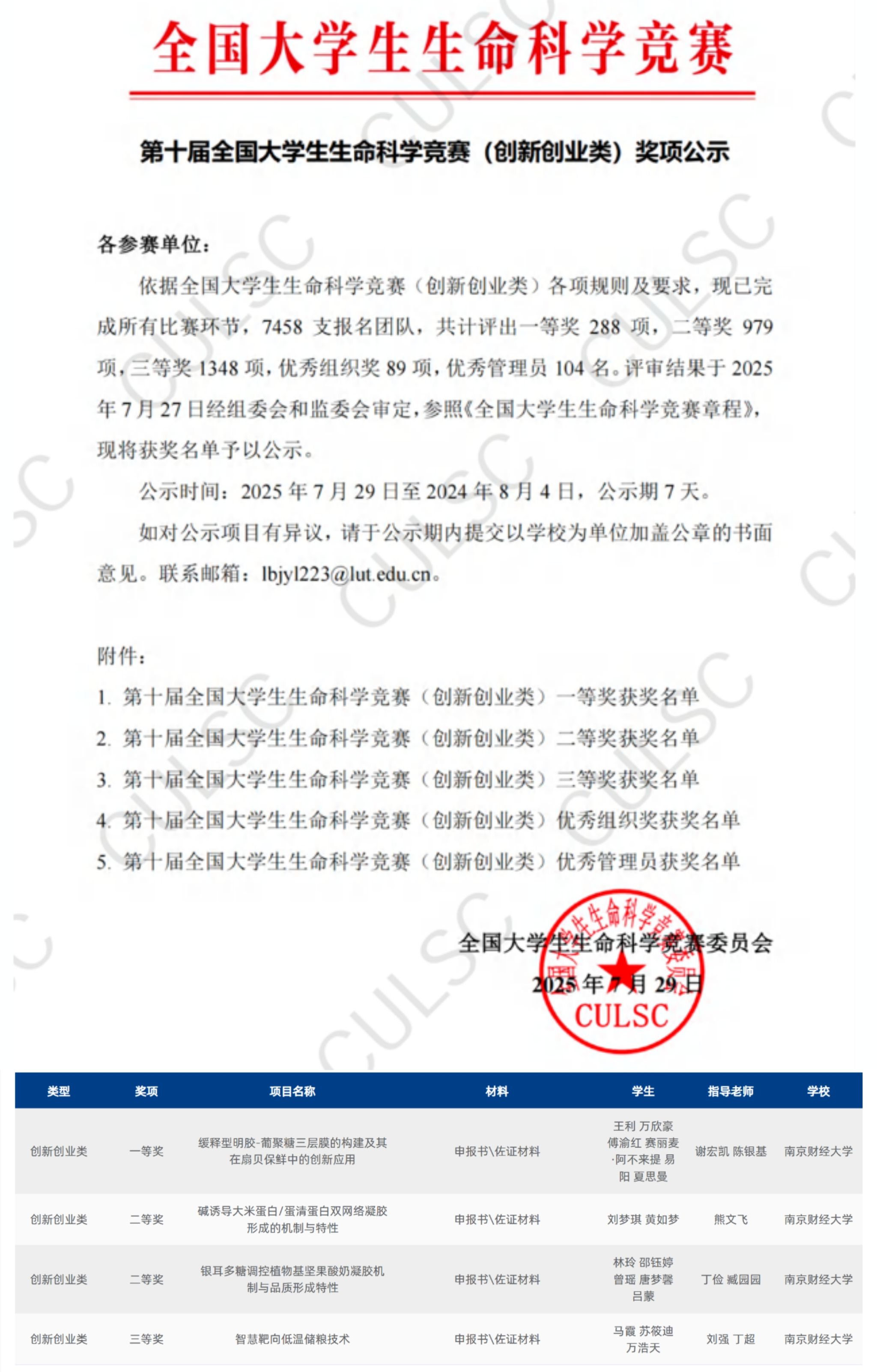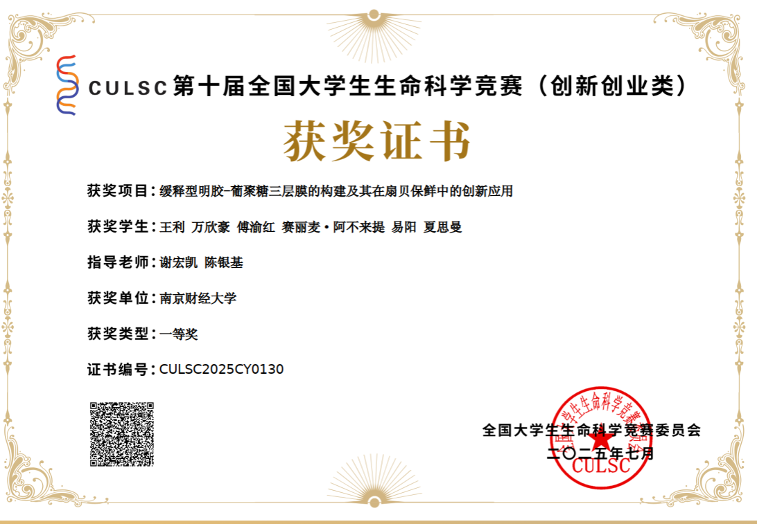谢宏凯、陈银基两位老师悉心指导的项目《缓释型明胶——葡聚糖三层膜的构建及其在扇贝保鲜中的创新应用》,凭借新颖的研究思路、扎实的实验基础和良好的应用前景在全国决赛中脱颖而出,获得一等奖。该项目聚焦扇贝保鲜这一实际产业需求,创新构建缓释型三层膜,为水产品保鲜技术的升级提供了新思路,得到了评审专家的高度认可。