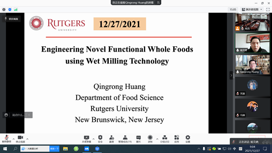 邀请,美国罗格斯大学黄庆荣教授为师生作了题为Engineering whole grain emulsion gels using wet milling technology的线上学术报告,学院部分师生代表参加了本次报告会,报告会由科研处副处长杨文建教授主持。