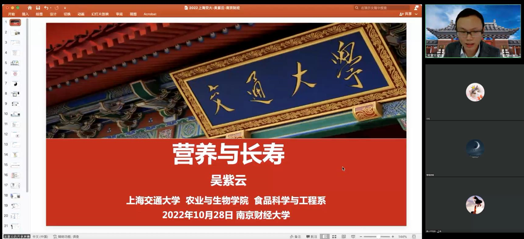10月28日上午,国家优青、上海交通大学长聘教轨副教授、博士生导师吴紫云应邀作了题为“营养与长寿”的学术报告,本次报告由黄色导航