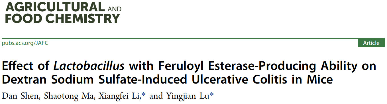 2022年11月17日,《Journal of Agricultural and Food Chemistry》(中科院一区,IF=5.279)在线发表了题为“Effect of Lactobacillus with Feruloyl Esterase-Producing Ability on Dextran Sodium Sulfate-Induced Ulcerative Colitis in Mice”的研究论文,被选为当期(2022,Volume 70,Issue 47)的封面论文(Front Cover)。该论文以黄色导航