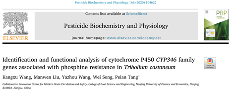 储粮害虫绿色防控团队在国际著名昆虫学期刊《Pesticide Biochemistry & Physiology》杂志上以研究论文发表了题为“Identification and functional analysis of cytochrome P450 CYP346 family genes associated with phosphine resistance in Tribolium castaneum”的研究成果。该项工作对我国多个赤拟谷盗种群的磷化氢抗性水平进行了监测;同时发现细胞色素P450酶系CYP346B亚家族基因在磷化氢抗性形成中起到了关键性作用,进一步在分子水平系统性证实解毒代谢参与了害虫对磷化氢的抗性发生机制。
