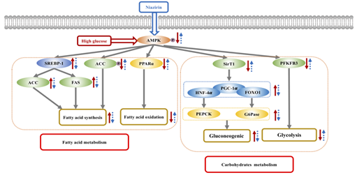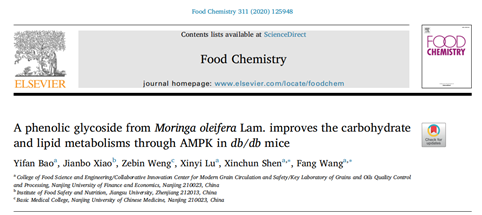 沈新春教授课题组从辣木中制备其特有的活性物质,niazirin。以 IR-HepG2 细胞作为胰岛素抵抗体外细胞模型初步评价 niazirin 的体外降糖活性,再以 db/db 小鼠作为糖尿病动物模型,研究 niazirin 对于胰岛素抵抗、糖脂代谢异常的改善作用机制。相关研究结果以“A phenolic glycoside from Moringa oleifera Lam. improves the carbohydrate and lipid metabolisms through AMPK in db/db mice”为题发表在Food Chemistry杂志上。黄色导航