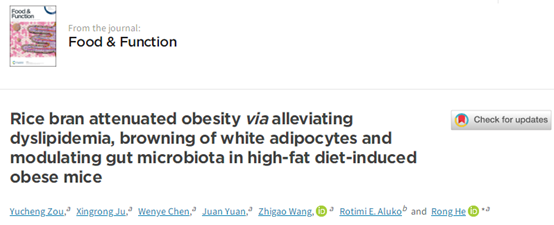 相关研究结果以“Rice bran attenuated obesity via alleviating dyslipidemia, browning of white adipocytes and modulating gut microbiota in high-fat diet-induced obese mice”为题发表在Food & Function杂志上,何荣副教授为通讯作者。本研究得到国家重点研发项目的资助。