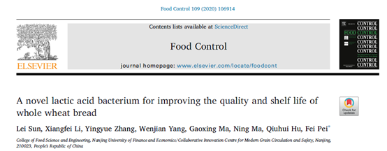 裴斐副教授课题组利用新型植物乳杆菌LB-1与酵母菌协同发酵技术开发新型全麦面包产品,显著改善了全麦面包质构、风味及贮藏特性。相关结果以“A novel lactic acid bacterium for improving the quality and shelf life of whole wheat bread.”为题发表在Food Control杂志上。黄色导航