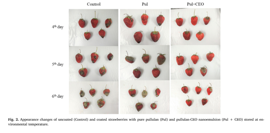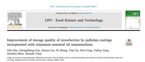 草莓果实营养丰富,拥有“水果皇后”的称号。然而,草莓成熟后表皮极薄,在采摘和储存过程中极易受到机械损伤与细菌霉菌侵染,通常情况下在常温放置3天即失水霉烂严重,失去商业价值。因此,如何维持新鲜草莓的品质,延长草莓的储藏时间一直以来都是国内外研究人员的热点问题。涂膜保鲜法因为具有操作简单易行、良好的气体选择透过性和有效防止微生物侵入等优势,成为近年来果蔬采后保鲜领域的热点研究方向。本研究以天然高分子可降解材料普鲁兰多糖为成膜基材,添加肉桂精油纳米乳液以提升复合膜的抗菌性能。对新鲜草莓涂抹保鲜的应用研究发现, 经过肉桂精油纳米乳液/普鲁兰多糖基复合膜液涂膜后的草莓,其在贮藏期结束时的重量损失、腐败率、硬度、可溶性固形物、可滴定酸和微生物指标均显著好于纯普鲁兰膜液组和对照组的草莓。实验结果表明草莓果实经过肉桂精油纳米乳液/普鲁兰多糖基复合膜液涂膜处理后,可以有效地延长贮存期,延缓衰老,并保持良好的外观品质,可见使用肉桂精油纳米乳液/普鲁兰多糖基复合膜液涂膜是一种极具潜力的保鲜手段。相关研究结果以“Improvement of storage quality of strawberries by pullulan coatings incorporated with cinnamon essential oil nanoemulsion”为题发表在LWT杂志上,黄色导航