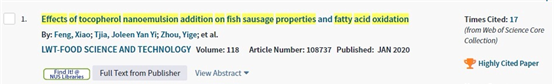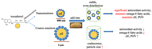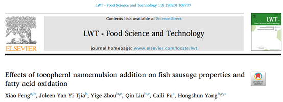 包埋维生素E的纳米乳液在鱼肠中的添加可以有效延缓鱼肉肠内油脂的氧化,并且对其中的不饱和脂肪酸起到保护作用。相比较而言,微米级的维E乳液添加对于鱼肠的脂肪氧化并没有显著的抑制作用。纳米乳液具有粒径小、分布均匀且较稳定的性质,促使维生素E发挥了显著的抗氧化作用。与此同时,研究发现纳米乳液的添加并不影响鱼肠的质构及色泽,可以广泛应用于食品工业生产中。相关研究结果以“Effects of tocopherol nanoemulson addition on fish sausage properties and fatty acid oxidation”为题发表在LWT杂志上,并入选农业科学领域ESI高被引论文。黄色导航