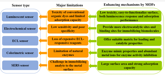 图1 常见传感器的主要缺陷及MOF材料在解决此类主要问题中的增强机理