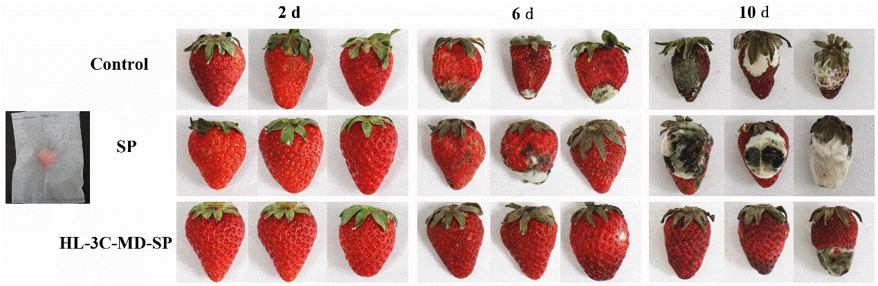 当配方为4% HPCD/LAE-3%CEO-9%MD (HL-3C-MD)时,微胶囊粒径最小(3.3 μm),CEO包封率最高(84.51%),抗菌效果最佳。微胶囊(HL-3C-MD)可以填充在淀粉/PBAT膜基质的界面空隙中,增加了膜结构的致密性,提升了薄膜的机械性能,在保持较好断裂伸长率(243.92%)的同时,还提升了膜的阻水、阻氧性能,同时表现出优良的抗菌活性。HL-3C-MD-SP的包装有效降低了草莓在储存期间的失重率(49.03%)、腐烂率(40.59%),保持较好的硬度和可溶性固形物含量,对霉菌(2.936 log CFU/g)和细菌(2.474 log CFU/g)都有很好的抑制效果,提升了草莓品质,延长了草莓的货架期。