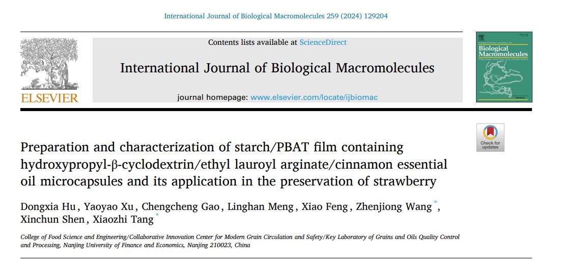 汤晓智、汪振炯在期刊INTERNATIONAL JOURNAL OF BIOLOGICAL MACROMOLECULES(Q1,IF: 8.2)发表题为“Preparation and characterization of starch/PBAT film containing hydroxypropyl-β-cyclodextrin/ethyl lauroyl arginate/cinnamon essential oil microcapsules and its application in the preservation of strawberry”的研究性论文。
