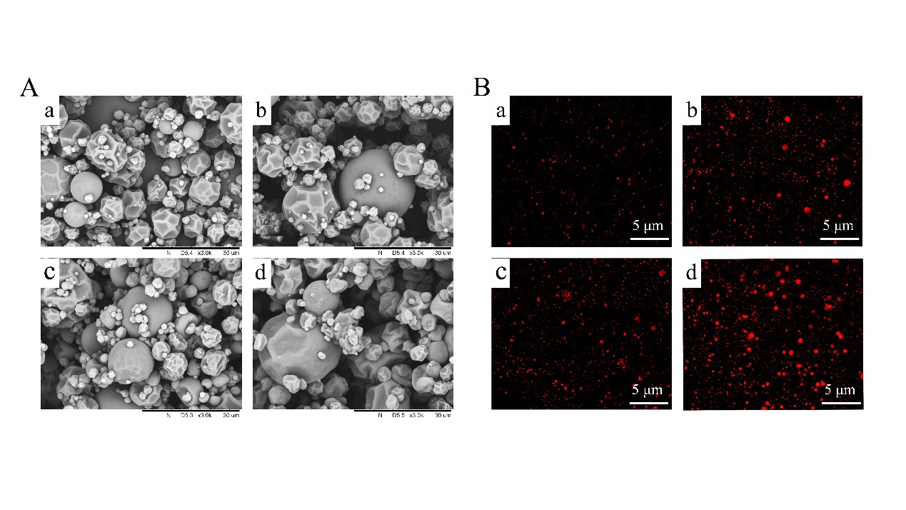Fig. 2. A: SEM images (a: HL-3C-MD; b: HL-3C2M-MD; c: HL-3C4M-MD; d: HL-5C2M-MD); B: Fluorescent images of microcapsules (a: HL-3C-MD; b: HL-3C2M-MD; c: HL-3C4M-MD; d: HL-5C2M-MD).