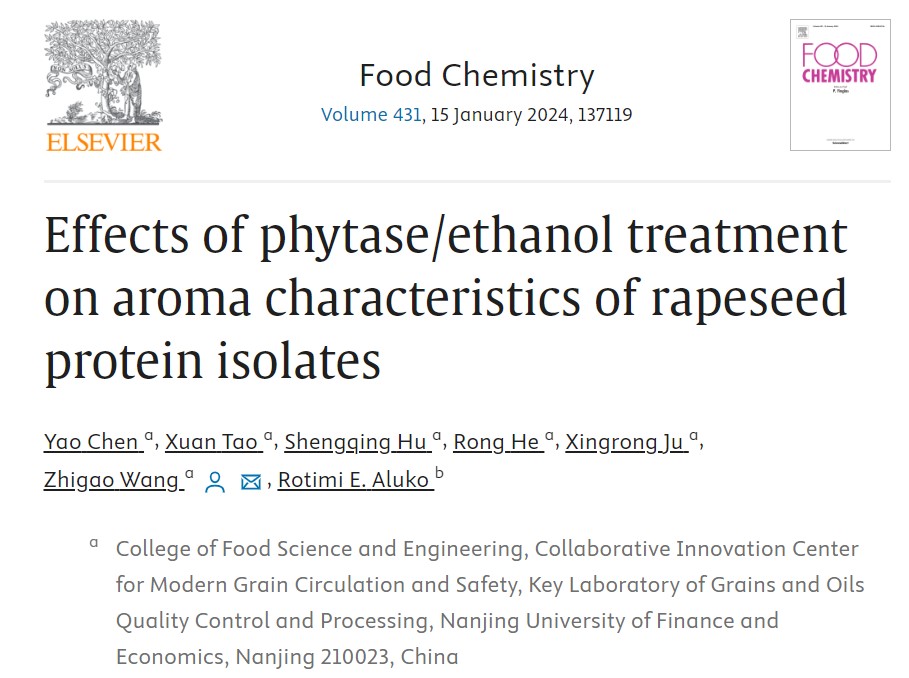王志高副教授(通讯作者)在国际TOP期刊Food Chemistry(Q1,IF: 8.8)发表题为“Effects of phytase/ethanol treatment on aroma characteristics of rapeseed protein isolates”的研究性论文。黄色导航