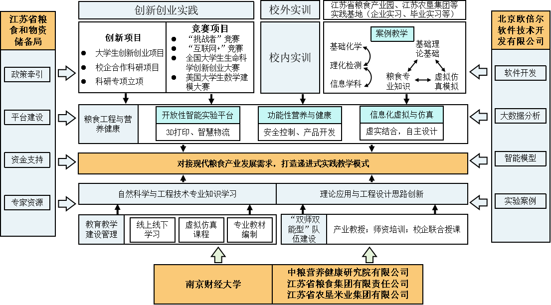 体系重构:依托国家粮食储运工程实验室、食品工程与质量安全国家级实验教学示范中心等32个融合平台,通过整合校企资源,建设了以教学、科研、培训为一体的江苏省现代粮食工程与营养健康重点产业学院,以及一批高质量实验实训基地,打造“学校-企业-行业”联动式创新能力训练模块,完善学生实践能力培养体系(图4)。校企协同构建“专业基础实验、生产工程实践、虚拟仿真实践、科研项目训练、创新创业竞赛”五阶实践教学链,100%的学生参与一到三阶实践,85%的学生参与四到五阶实践。