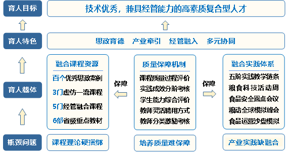 黄色导航 和浙江工商大学地处长三角经济发达地区江苏省、浙江省两个经济大省,在新常态下国家经济社会发展背景下,两校重点围绕食品科学与工程、食品质量与安全、粮食工程等食品类核心专业,探索了适应经济和时代发展的食品科学与工程类人才培养模式,形成了较为完善的融合人才培养的理论体系,共同凝练“技术优秀,兼具经管能力的高素质复合型人才”的培养理念,发挥学科交叉和产教融合优势,对理论课程、实践教学和协同机制进行多元化改革,破解技术与管理、理论与实践割裂的问题,构建了“产业牵引、经管融入、多元协同”的融合育人模式(图2)。